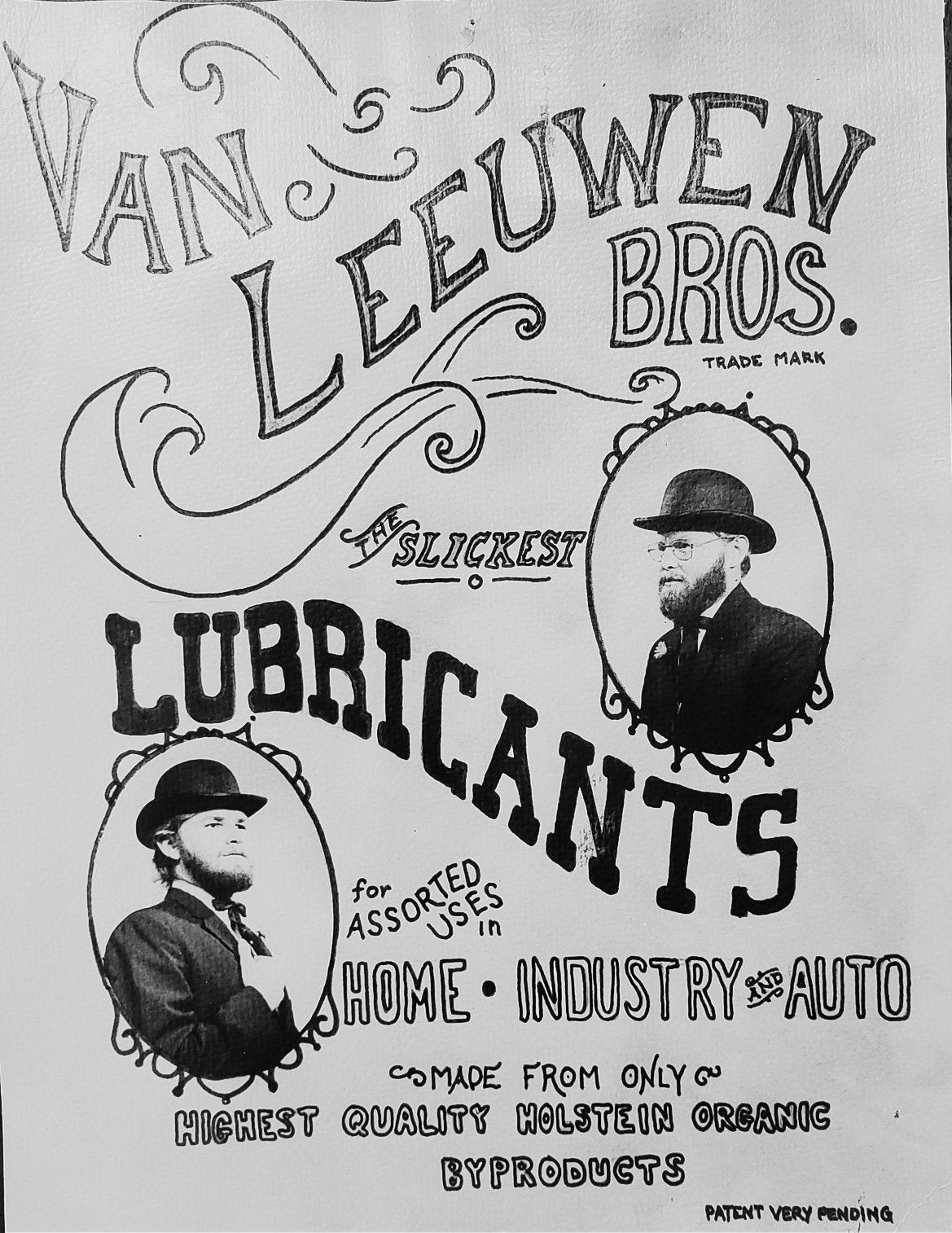 It was the early 1970s and our Uncle's, Arlan and Jerry Van Leeuwen, young dairymen, had read an enthusiastic trade article about the future of cattle manure being converted to basic oil needs for America. After an evening of laughter and dreaming of what it would like to be old time entrepreneurs, They made a spoof flier, They called it "Van Leeuwen Bros Lubricants.”